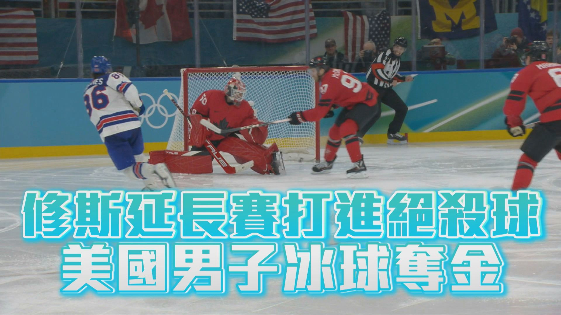 冰球金牌戰世紀之爭 美加NHL全明星對決 克羅斯比受傷無法上 首節美加互飆進攻 希列巴克捍衛球門 波蒂一打二美國進球 第二節加國瘋狂射門 19次射正等待機會 副隊長馬卡射門破網 加拿大扳平戰局 美加氣氛劍拔弩張 第二節結束大規模衝突 第三節各種射不進 美加延長驟死賽分高下 OT第二分鐘就進球 J.修斯打進黃金進球 1980後再度奪金 美國奪本屆第12面金牌